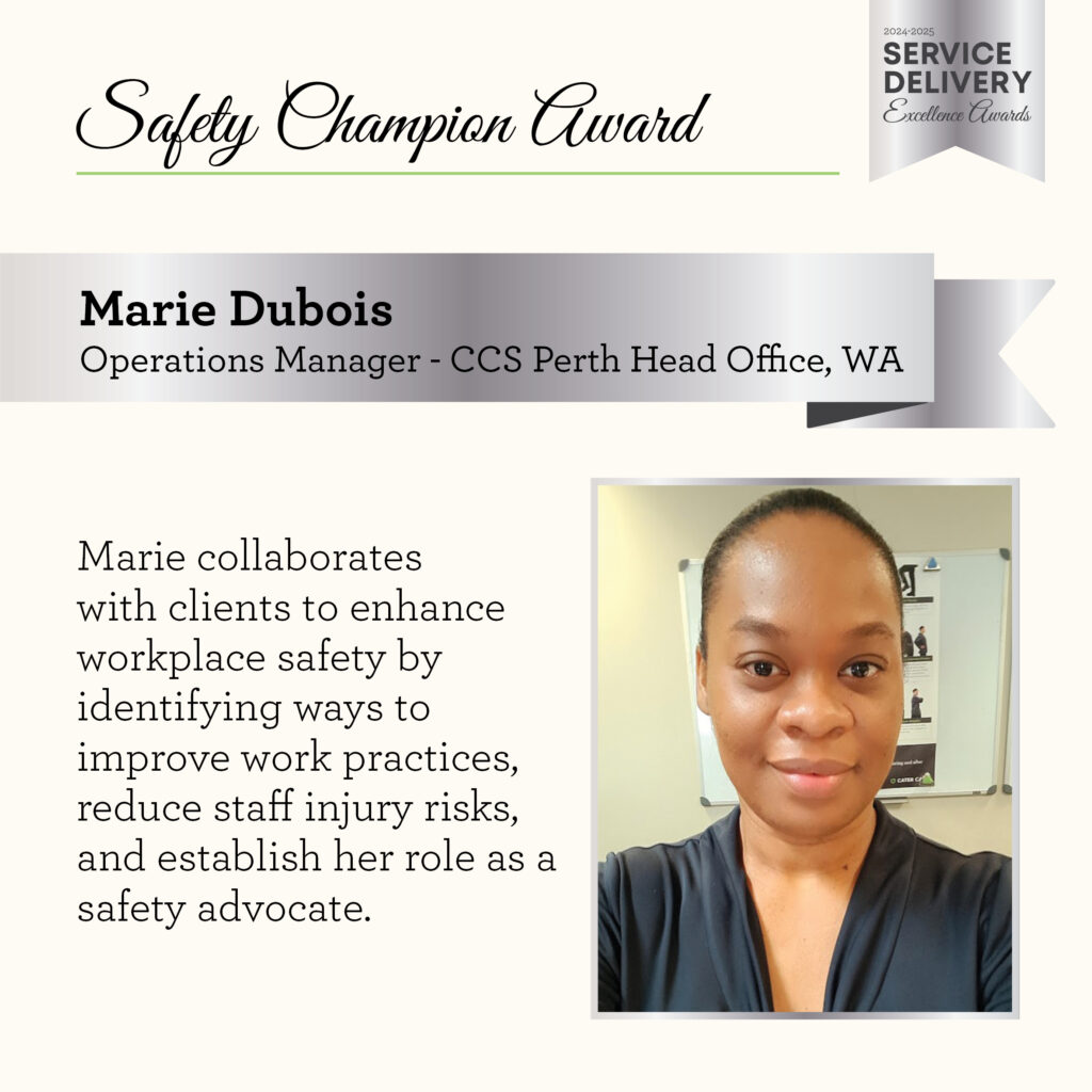 Our Service Delivery Excellence Awards play a key role in recognising our Safety Champions. These Awards commend team members who consistently demonstrate outstanding qualities in key areas of service, and the Safety Champion Award recognises individuals who uphold our values by creating safer environments for themselves and those around them Over the past year, our quarterly Safety Champion Award winners have truly demonstrated what it means to live out Cater Care’s commitment to safety.
